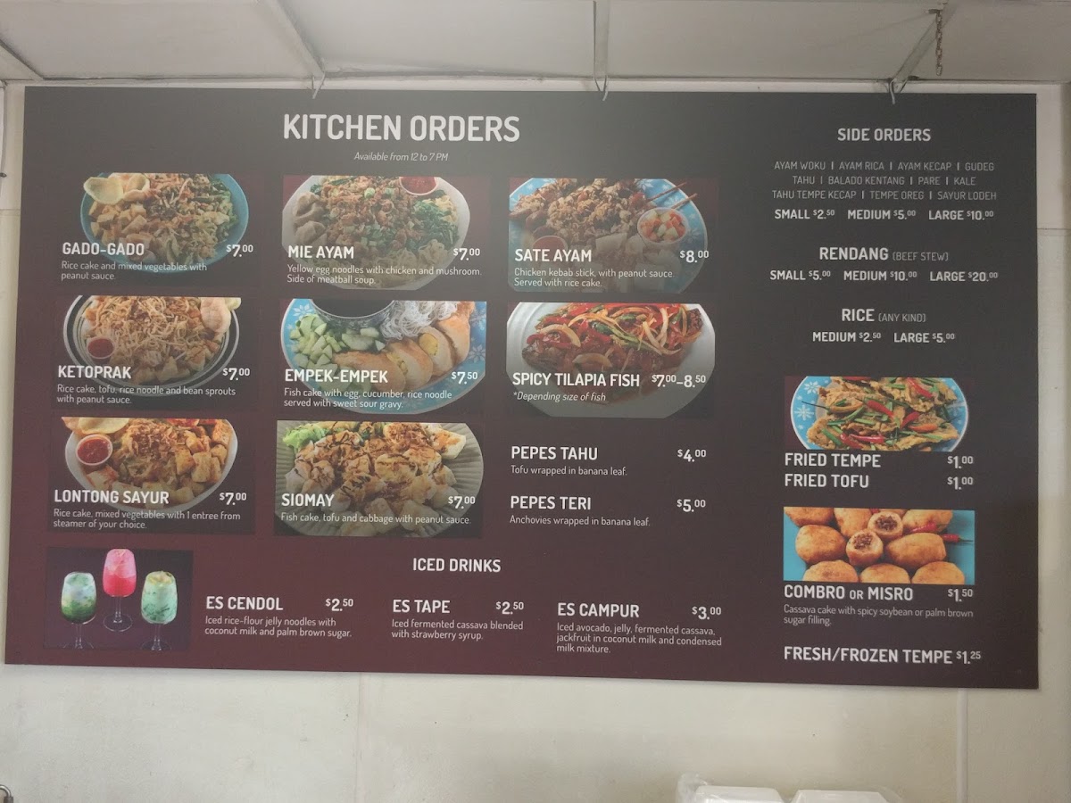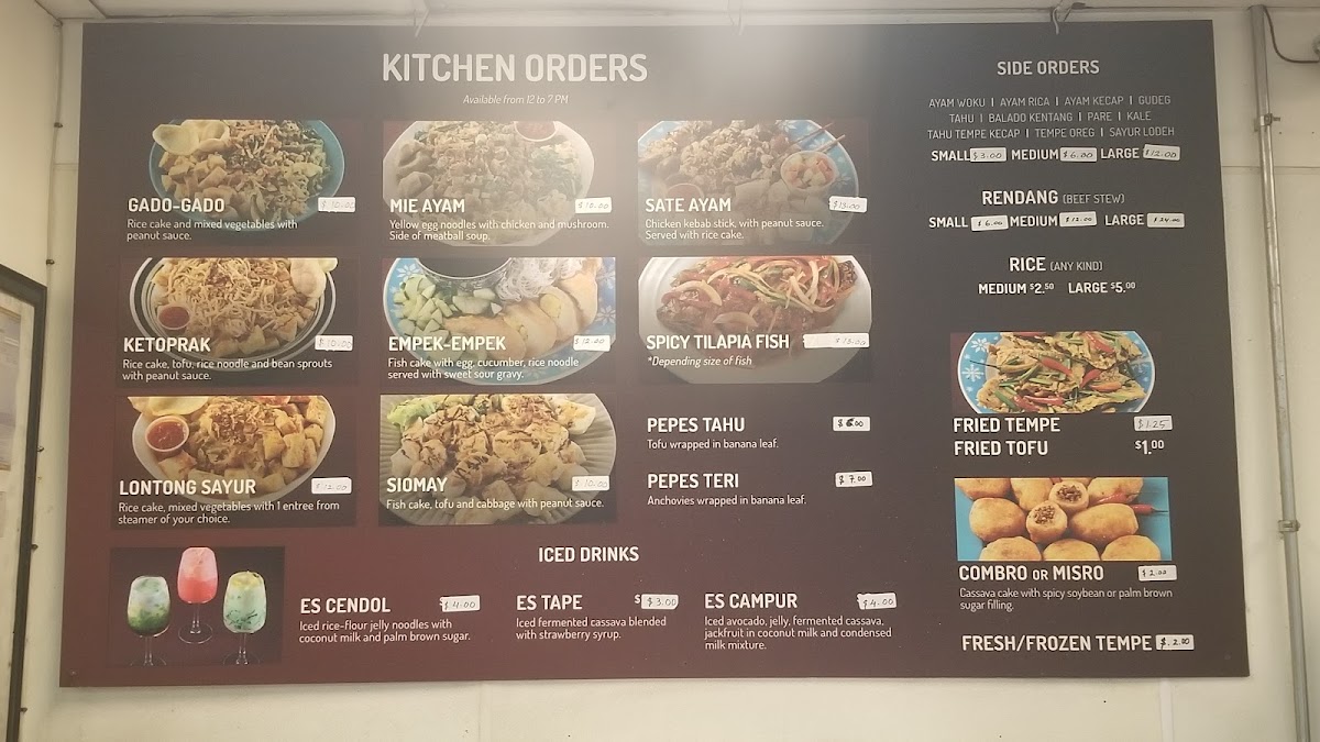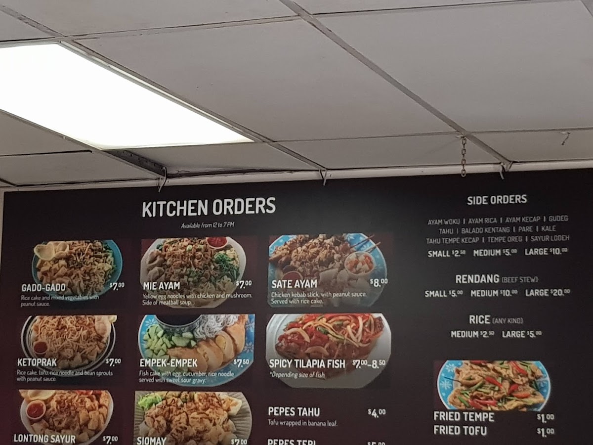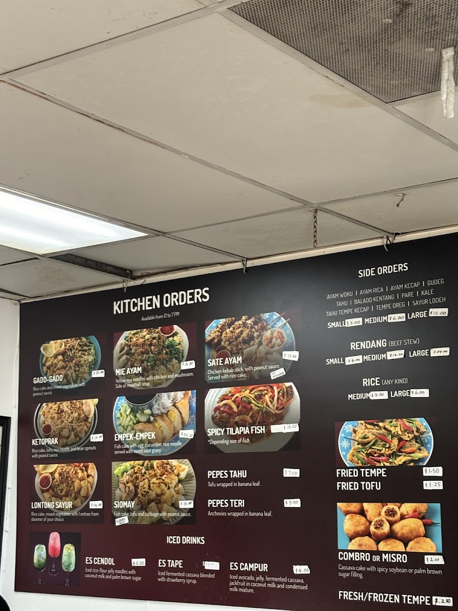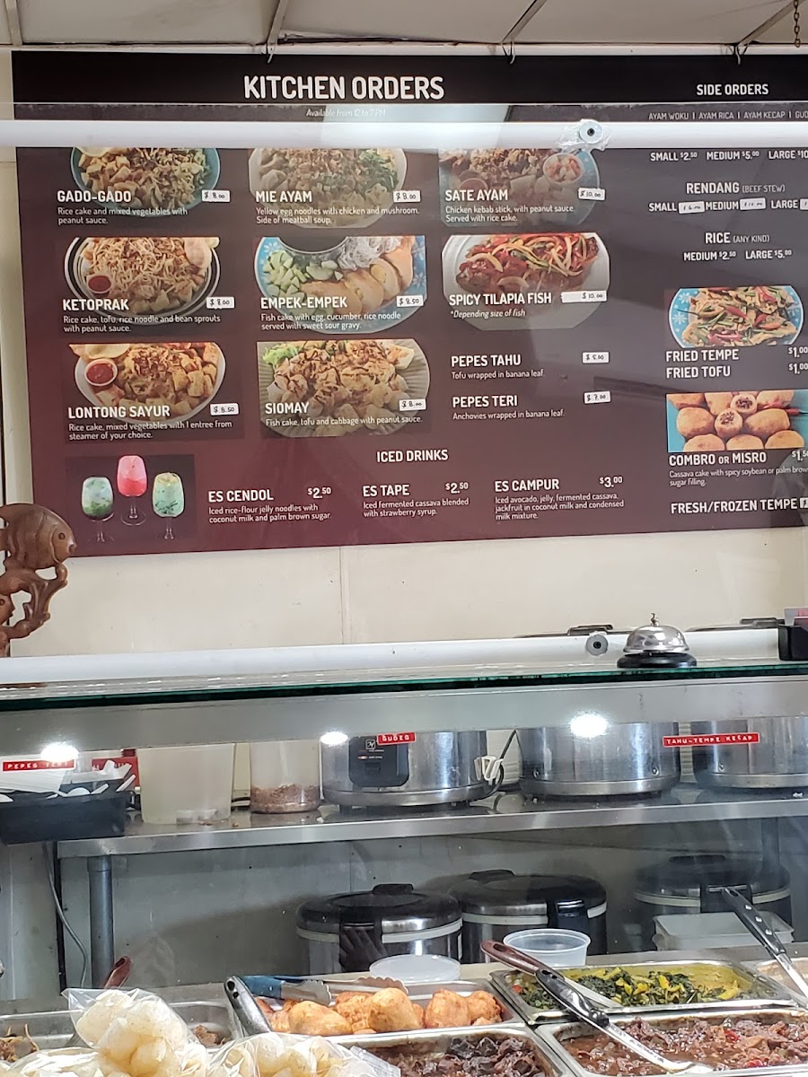 Guests can expect dishes like fried tempeh, spicy chicken and beef, and beloved staples such as gado gado and sayur lodeh—perfect for those who enjoy bold, layered flavors. Options like white rice, yellow rice, and nasi uduk provide a comforting base, while selections like sate ayam and rendang showcase traditional Indonesian barbecue and slow-cooked richness. There are also considerate vegetarian choices including tempeh and tofu preparations, appealing to a diverse range of cravings.